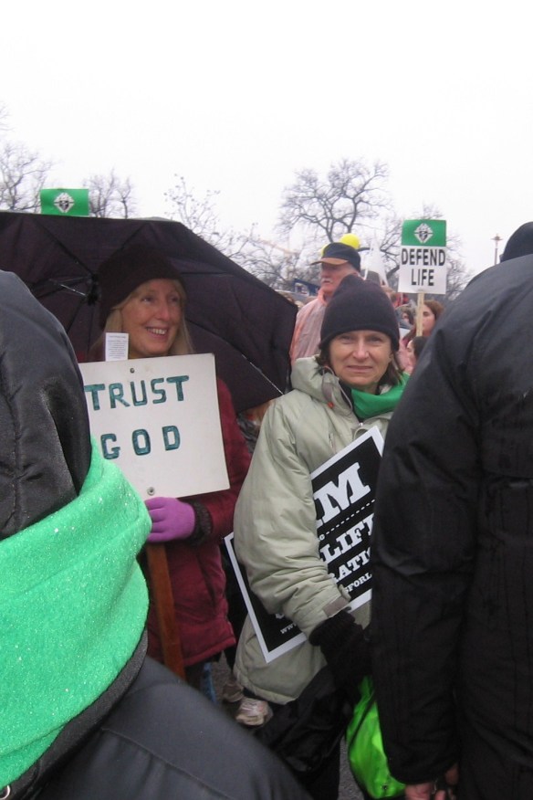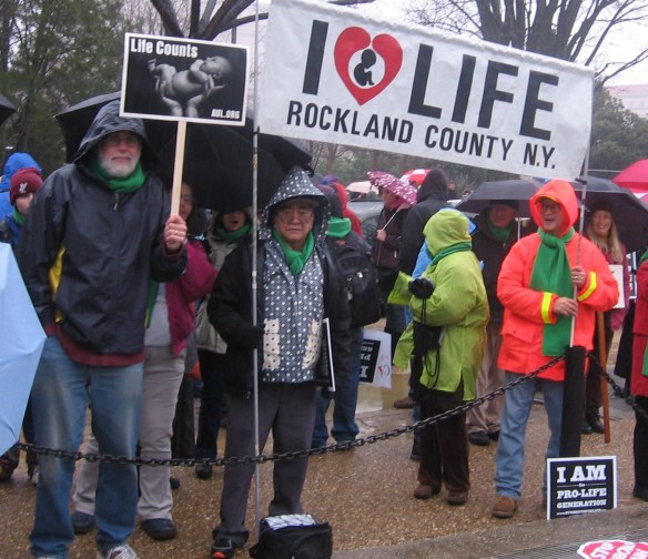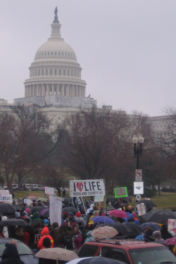 We choose a place on the edge of the Mall and claim it for Rockland Right to Life. We make our stand here. The program has just started, just some 400 yards from us. The stage is huge, like at a major rock concert, and the voices of the speakers carry out across thousands and thousands of prolife faithful.