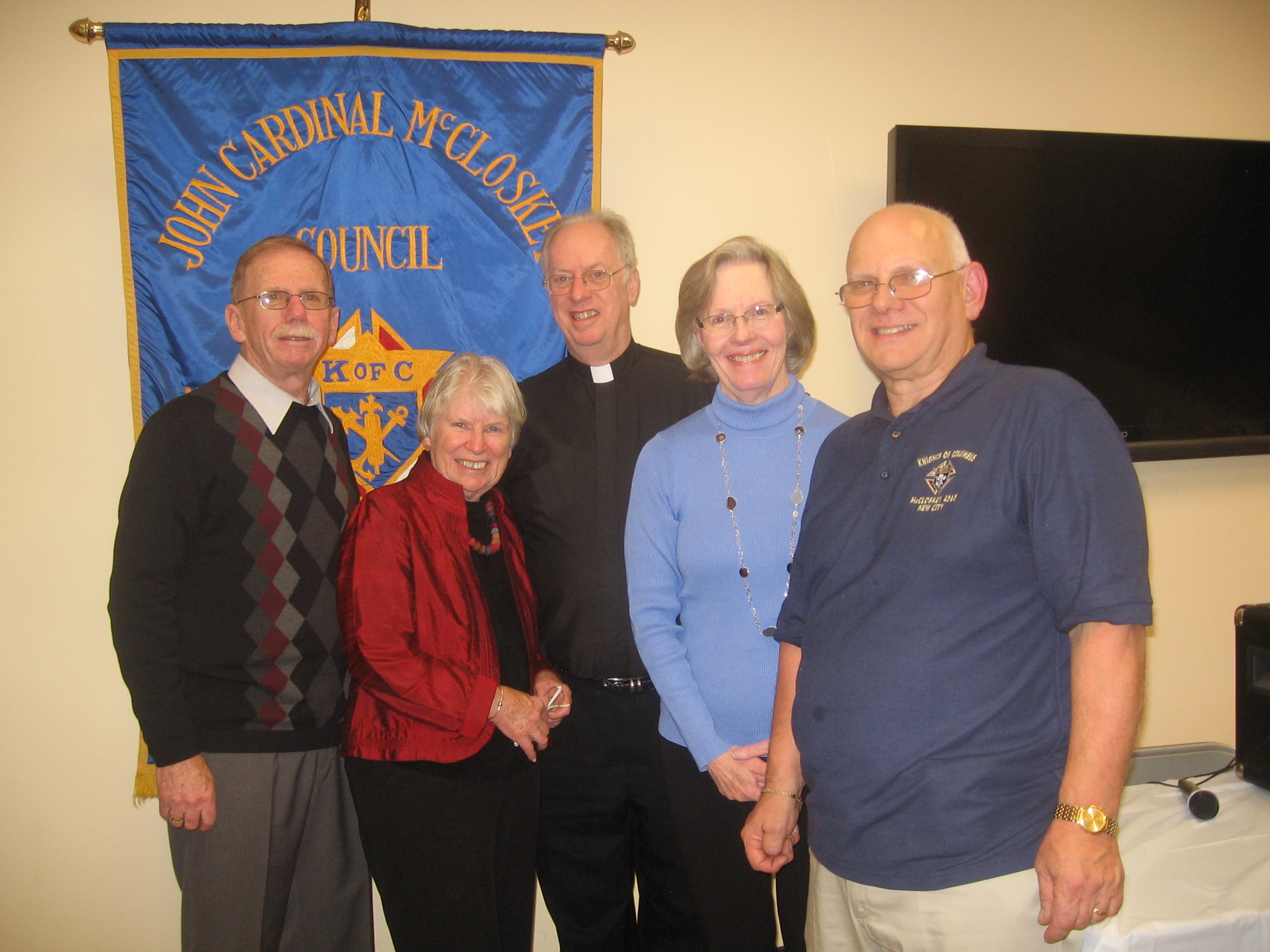 McCloskey Published December 18, 2012 at 2272 × 1704 in McCloskey Knights Celebrate Christmas with Charity and Good Will Hugh Delargy, District Deputy, Mary Loftus, Rockland RTL treasurer, Msgr. Edward Weber, McCloskey Council chaplain, Liz O’Brien, Rockland RTL chairman, and Arthur Saladino, Grand Knight