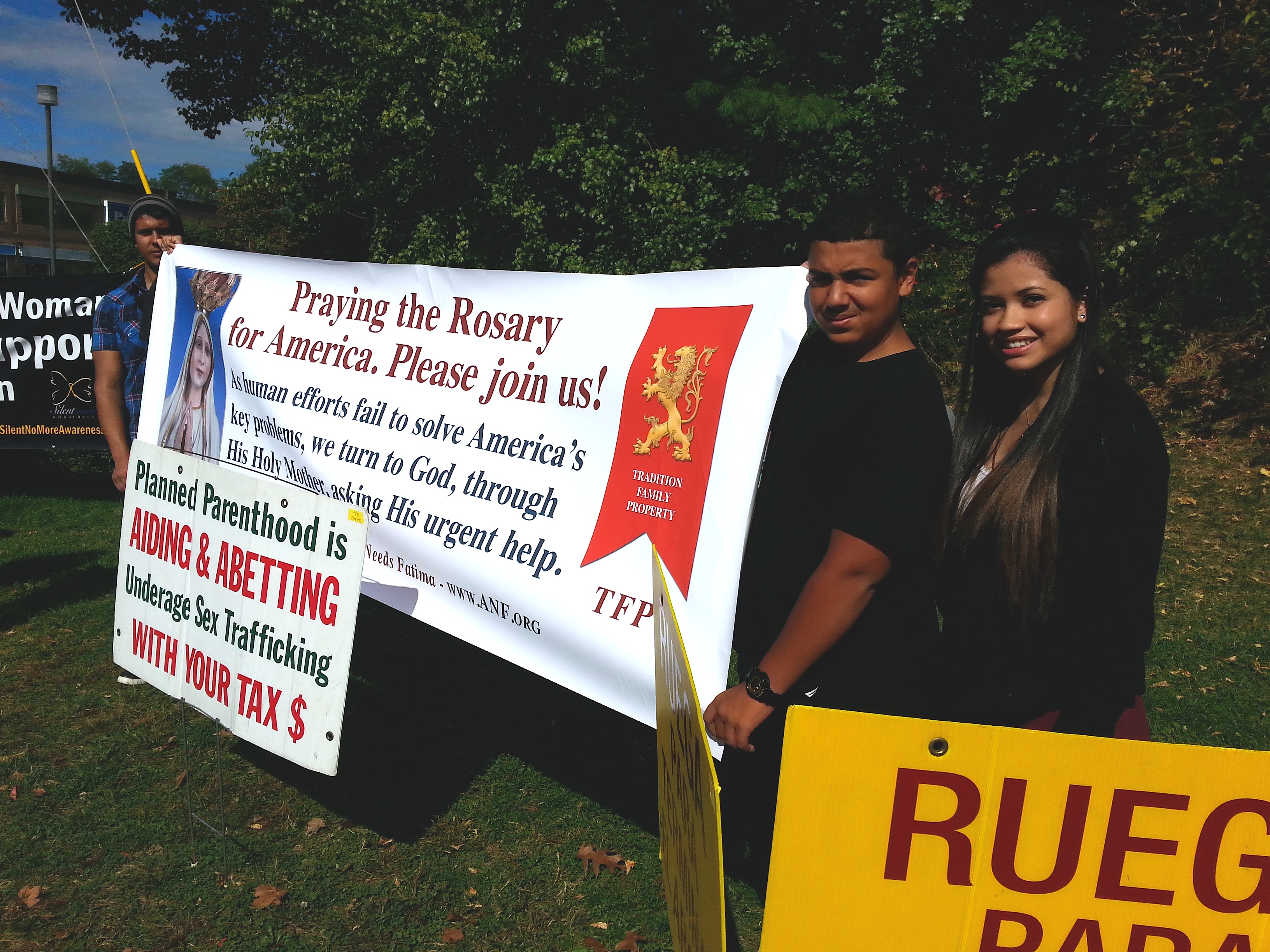 A beautiful, sunny autumn day brought an incredible turnout of over 40 prolifers of all ages — but especially young people — to the prayer site on Perlman Drive for the 12 to 1 pm hour on Saturday. The occasion was the Our Lady of Fatima Rosary Rally.
