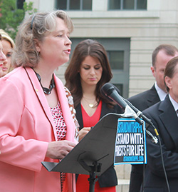 National Right to Life Committee President Carol Tobias spoke at a rally outside the U.S. Court of Appeals in Washington, D.C., today after oral hearings in the case of Priests for Life v. Sebelius.