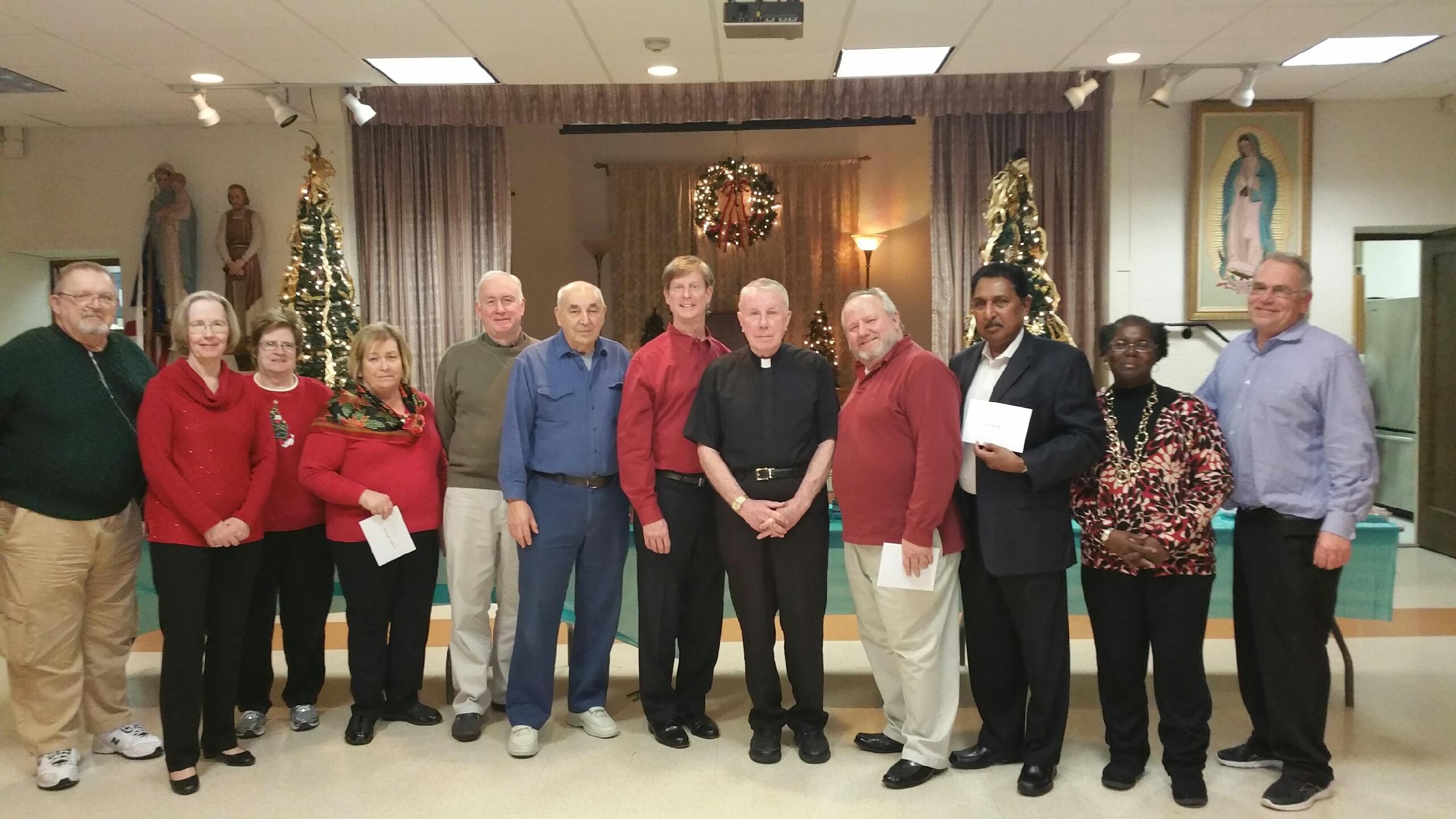 At the Triune Council 2052 Christmas Party, held at Toner Hall in St. Margaret’s Church in Pearl River: (L to R) Chet Nawoichyk (the Fisher Foundation), Liz O’Brien (Rockland RTL), Peg Beirne (Rockland Catholic Coalition), Ellen Traina (Birthright), Pete Noonan (COPS Barn), Dee DeFelice (Financial Secretary), Kevin McGovern (COPS Barn), Msg. John J. O’Keefe (pastor of St. Margaret’s) John Rio (Grand Knight), Joe Jacobs (Divine Providence), Nannette Morris (Good Counsel) and Bill Palino (Rockland Sister Cities Project). Photo by Frank Traina.
