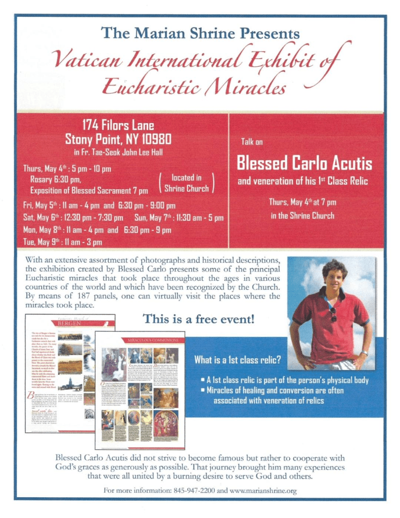 Vatican International Exhibit of Eucharist Miracles Posted on April 19, 2023 by rocklandrtl at the Marian Shrine in Stony Point Share this: Click to share on X (Opens in new window) X Click to share on Facebook (Opens in new window) Facebook Like Loading... Related