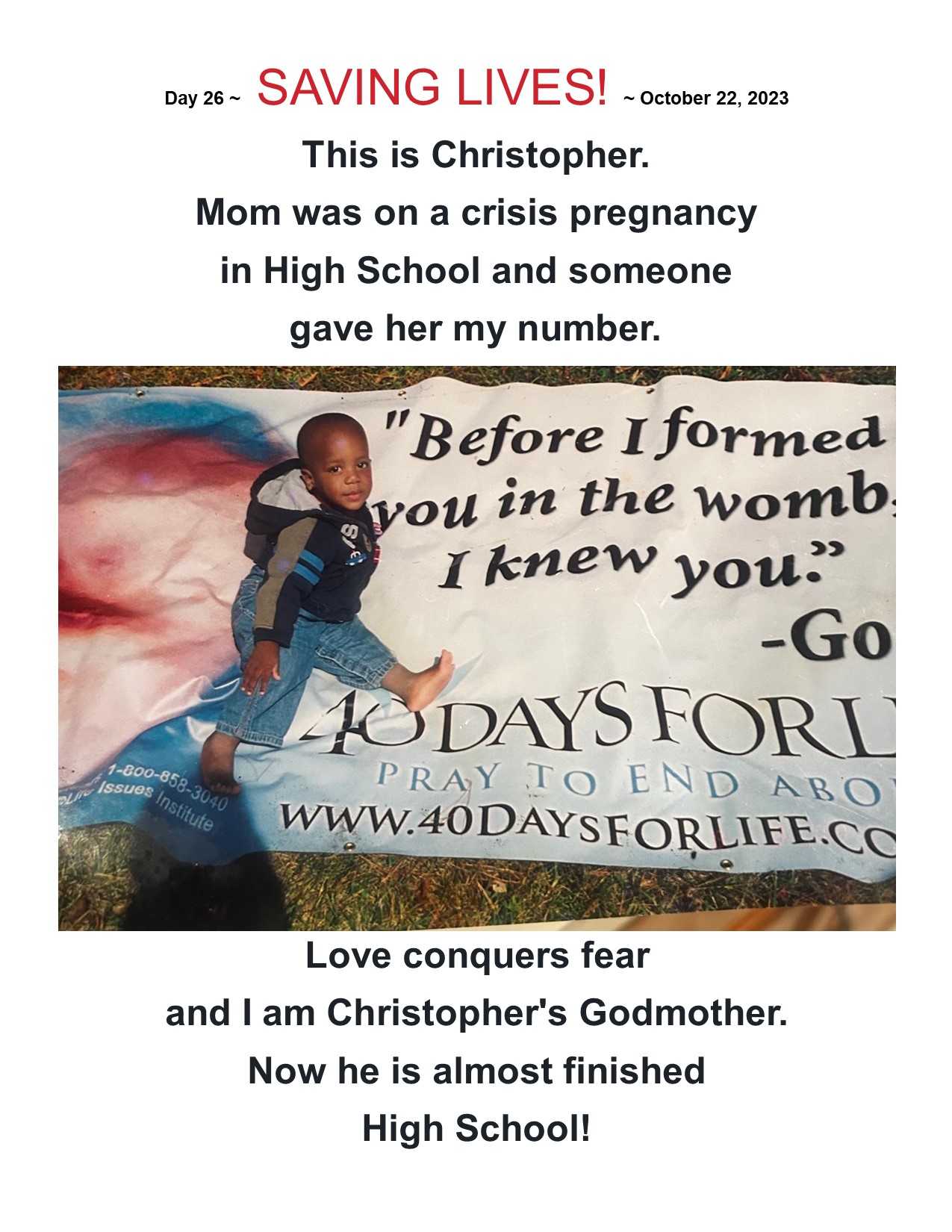 40 Days for Life – Day 26 Image Posted on October 24, 2023 by rocklandrtl Share this: Click to share on X (Opens in new window) X Click to share on Facebook (Opens in new window) Facebook Like Loading... Related
