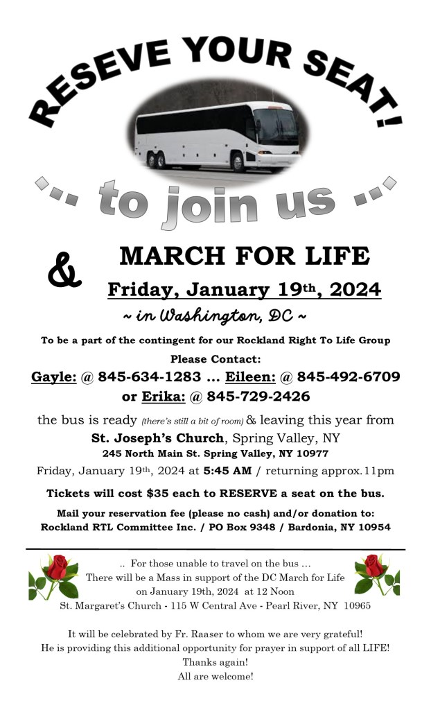 March For Life – Washington DC – Jan. 19th, 2024 – Rockland Info Image Posted on January 9, 2024 by rocklandrtl Share this: Click to share on X (Opens in new window) X Click to share on Facebook (Opens in new window) Facebook Like Loading... Related
