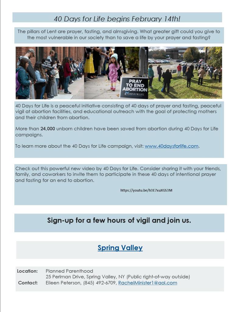 40 Days for LIFE begins2-14-2024 Image Posted on February 11, 2024 by rocklandrtl Share this: Click to share on X (Opens in new window) X Click to share on Facebook (Opens in new window) Facebook Like Loading... Related