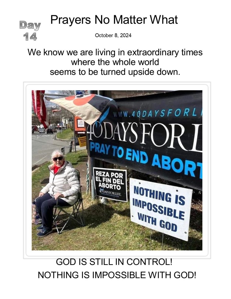 40 Days or Life – Day 14 Image Posted on October 9, 2024 by rocklandrtl Share this: Click to share on X (Opens in new window) X Click to share on Facebook (Opens in new window) Facebook Like Loading... Related
