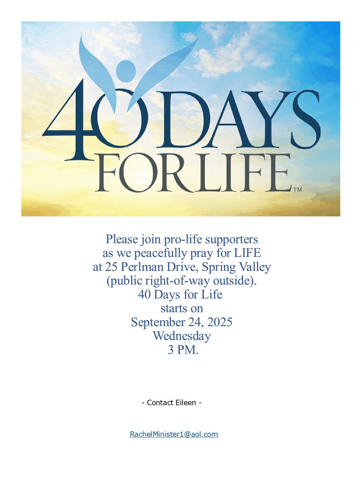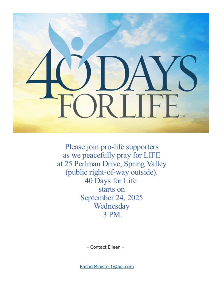 40 DAYS for LIFE – starts tomorrow – Image Posted on September 23, 2025 by rocklandrtl Share this: Click to share on X (Opens in new window) X Click to share on Facebook (Opens in new window) Facebook Like Loading... Related